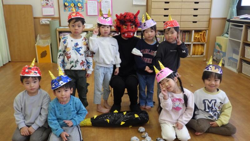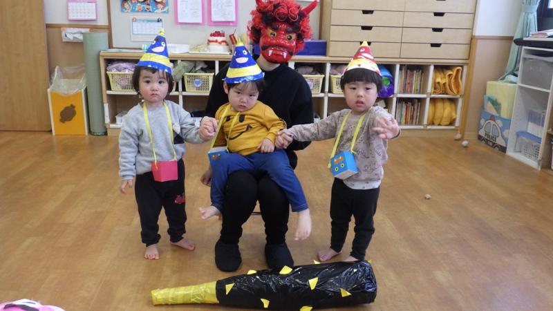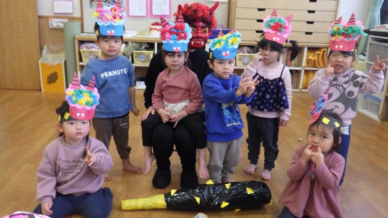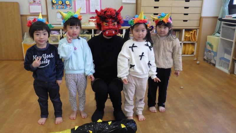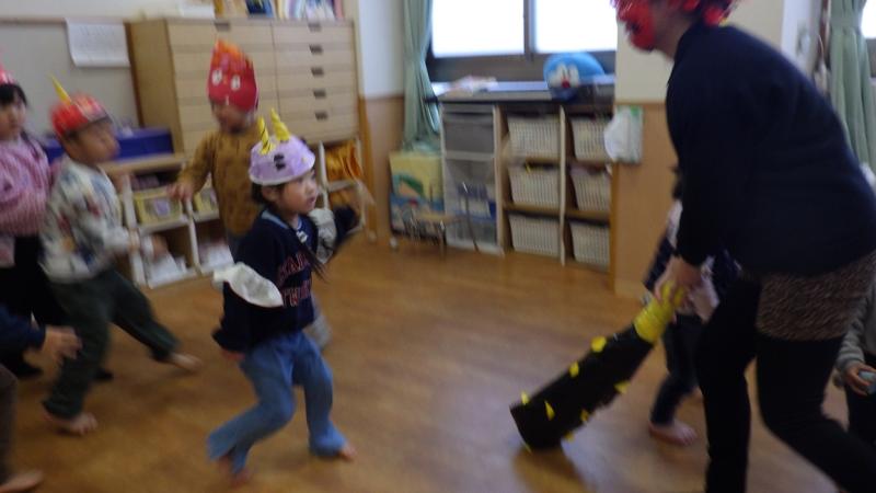紙芝居を見たり、「豆まき」の歌を歌っていると鬼が登場!!