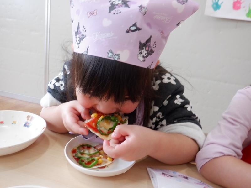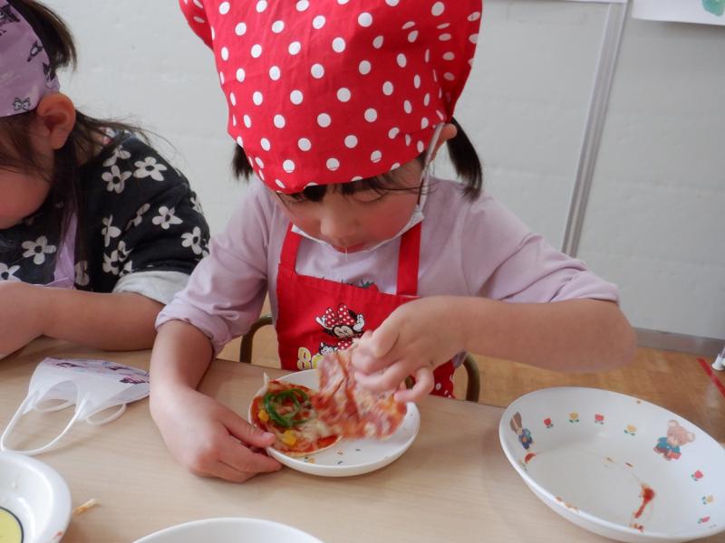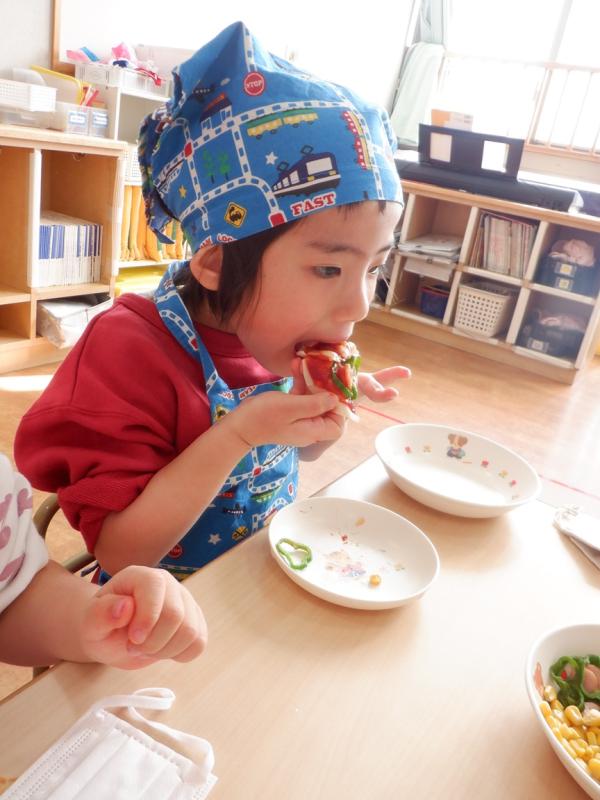 焼いているピザを見て、「ジュージューって音が聞こえる」と焼く工程も楽しんでいました。