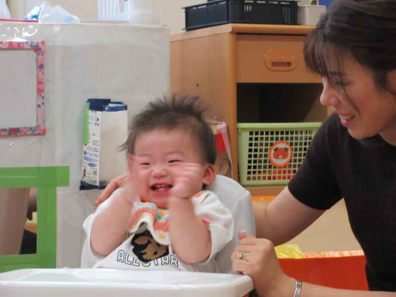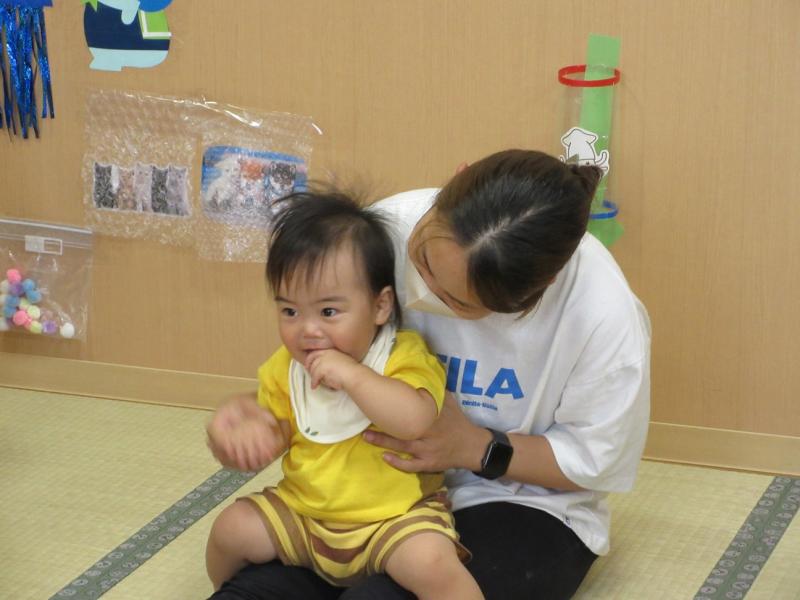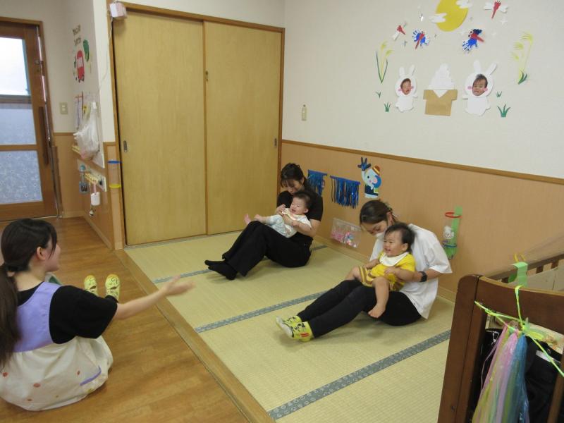 朝おやつ、朝の会の様子を見てもらい親子で「きゅうりができた」「バスにのって」