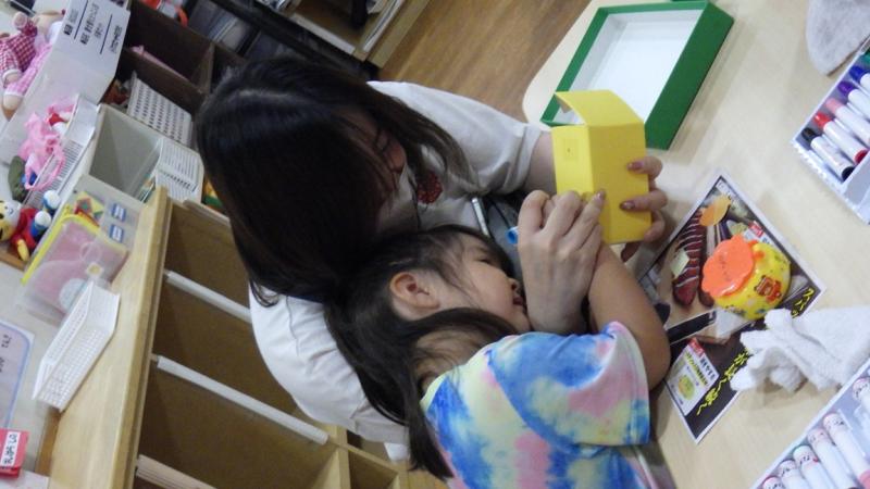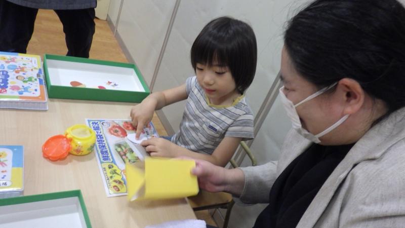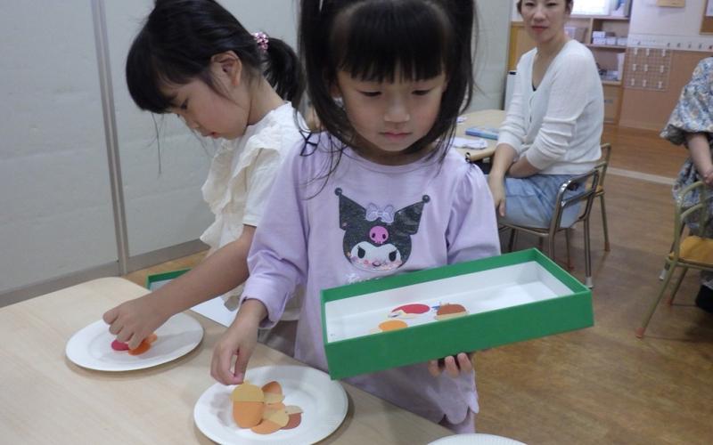 自分で貼るパーツを選び、のりづけや好きな絵を描きました。