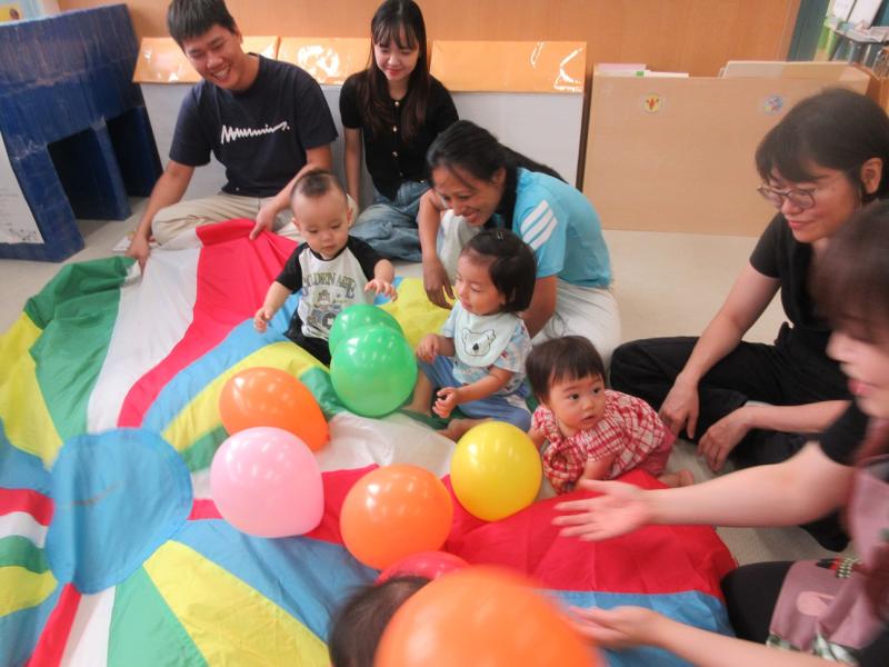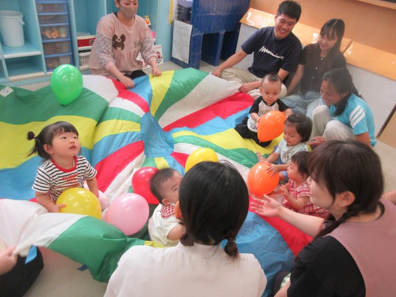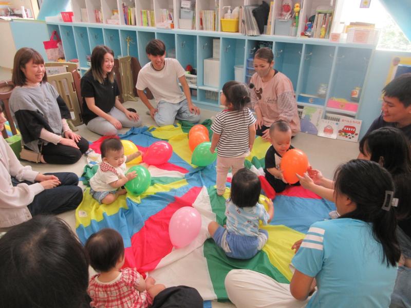普段の様子(おやつや朝の会)を見てもらってから、親子ふれあい遊びとバルーンをしました。