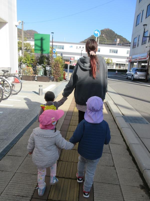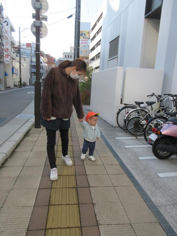 手をつないで外に出るとニコニコで、初めて手をつないで歩いた散歩とは