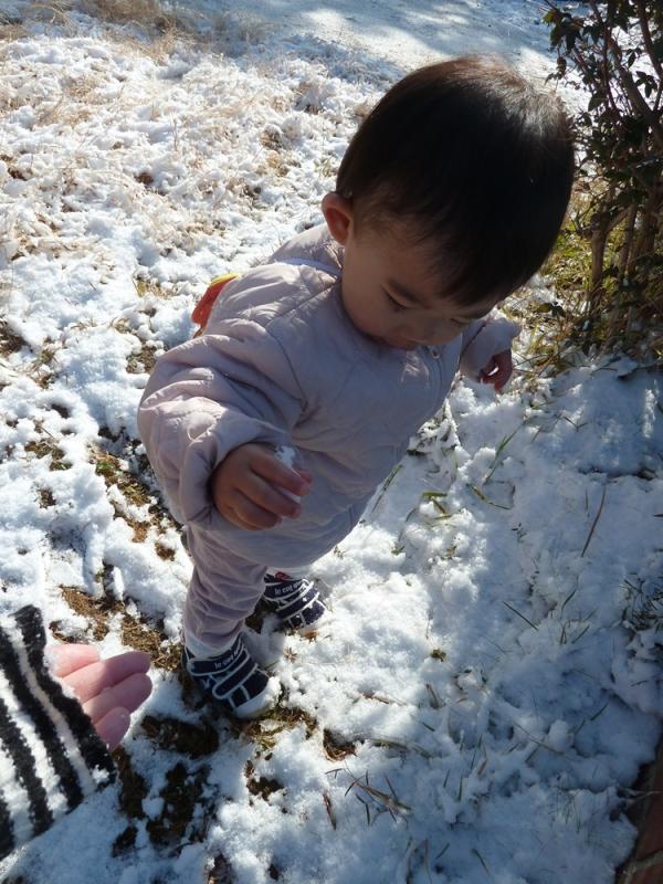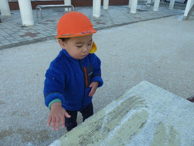 ふわふわの雪の上を一緒に歩くと、サクサク音がするのが面白くて喜んだり、手のひらで雪集めをしたり、