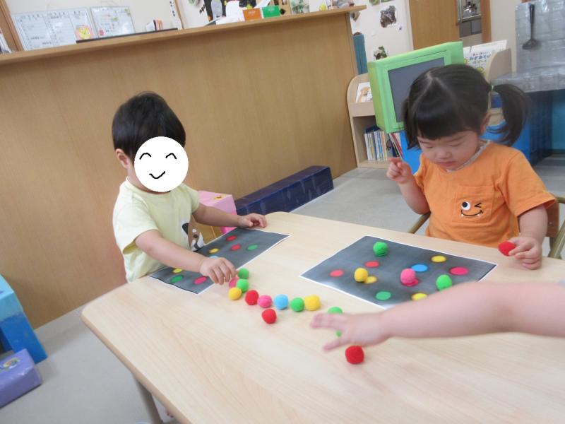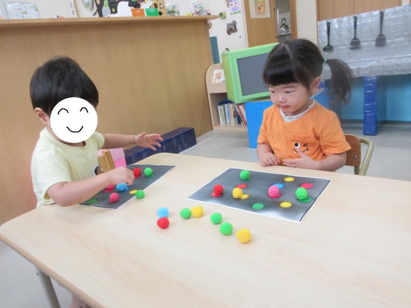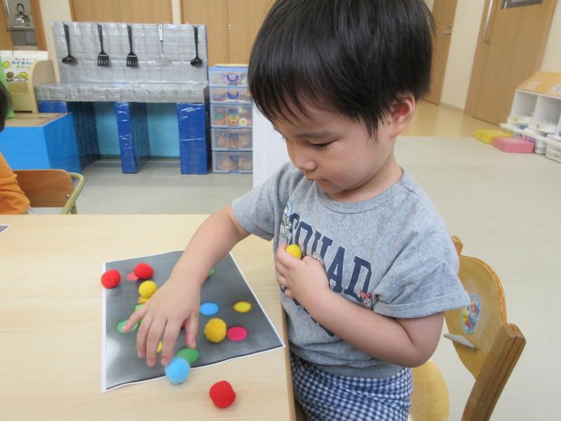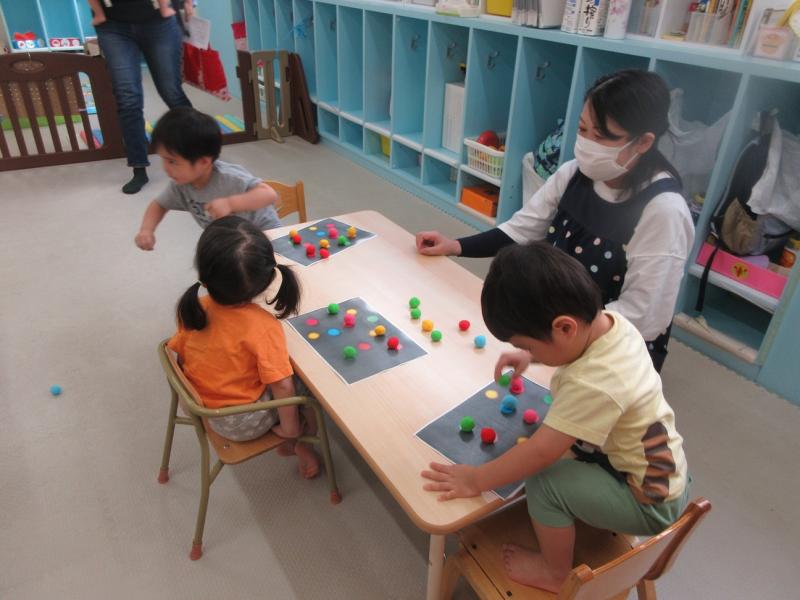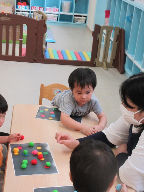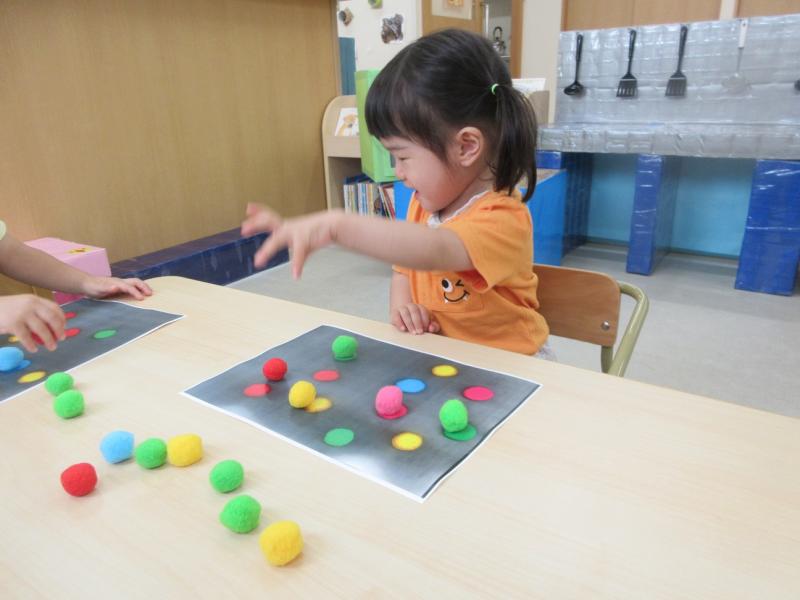 玉が写ったカラーシートの上に同じ色の玉を乗せる遊びをしました。